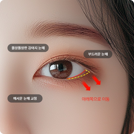 눈꼬리가 올라가 보이는 매서운 눈매일 경우 밑트임 수술을 통해 부드러운 눈매를 만들 수 있습니다.