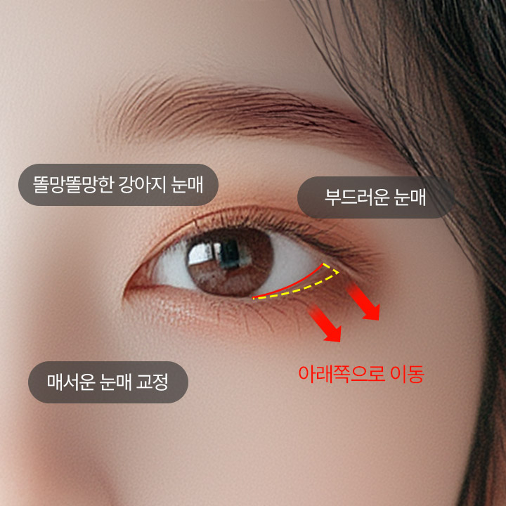 올라간 눈꼬리를 아래로 내려주면 눈이 커 보이면서 순해 보이는 효과를 볼 수 있습니다.