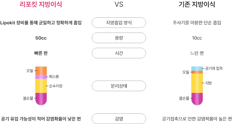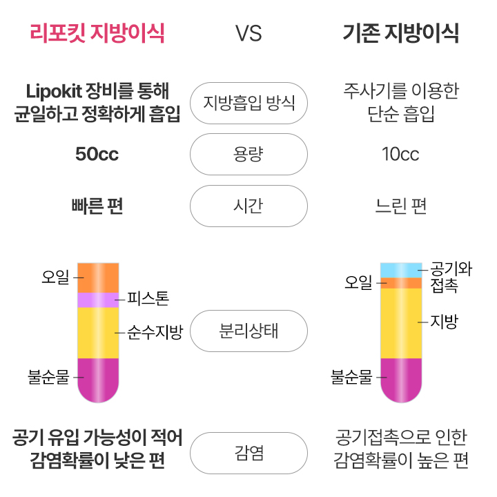 또한 엘리트 리포킷 지방이식은 지방이식시 생기는 오일(프리오일)을 제거하는 시스템을 이용하여 지방이식의 생착률을 높이고 부작용을 최소화합니다.