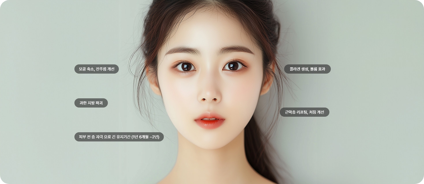 고강도 RF에너지와 IRE 기술의 비절개 윤곽 레이저를 SMAS층까지 전달하여 지방세포를 파괴하고 주름개선과 처진 피부에 리프팅 효과를 줍니다. 또한, 피부 표피의 자극 없이 에너지를 균일하게 전달시켜 피부결 개선 및 타이트닝 효과를 줍니다.